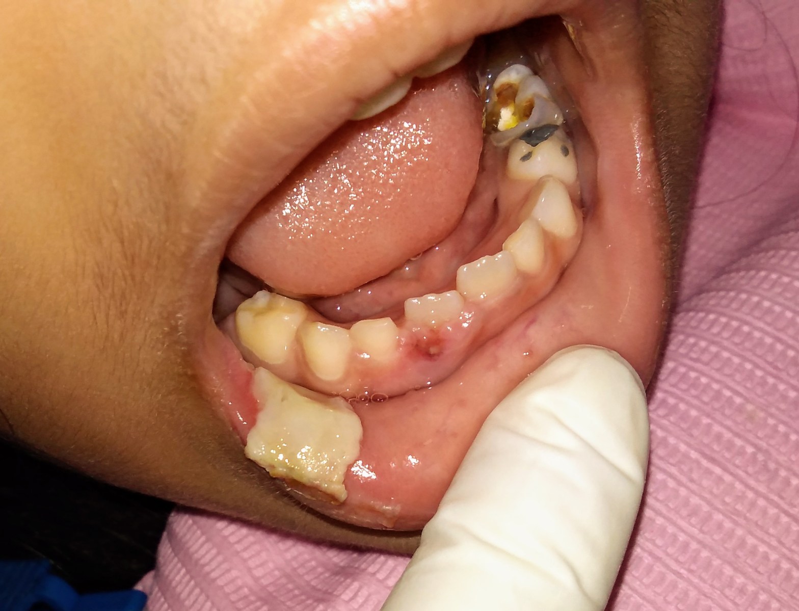 During this period, conditioning of the caregivers to allay the anxiety is imperative with the understanding that these injured tissues will heal without antibiotics. Apply ice pack for 3 days ( 15 minutes on 15 off)for one hour three times a day. Rinse with salt water for two times/day for three days. Give painkillers like paracetamol, apply topical numbing ointment and use chlorhexidine gluconate (0.12%)to debride ulcerated soft tissues.